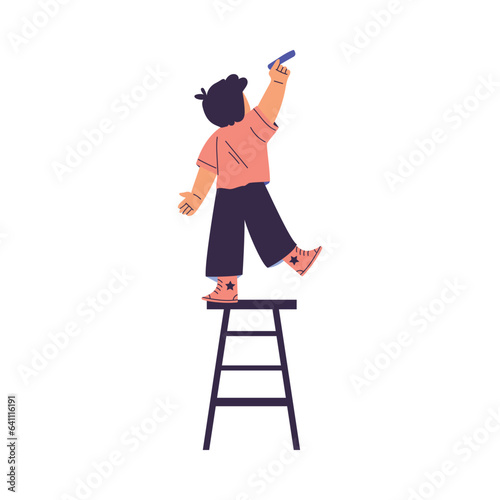 Little Boy Drawing on Wall with Colorful Crayon Standing on Stool Vector Illustration