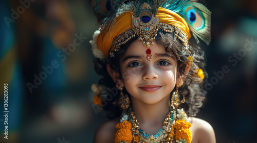 Little boy Krishna decorated with jewelry, peacock feathers, smiling on blurred dark background, Hinduism, Krishna Janmashtami