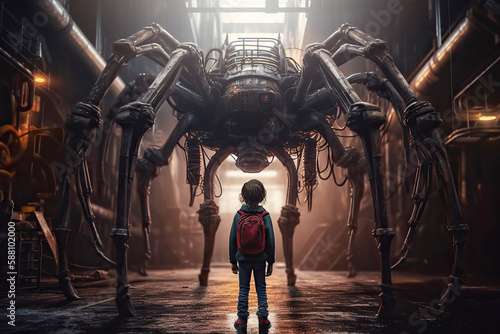 children, spider, fear, children, robot, dream, arachnophobia, children, phobia, boy, evil, big, scared, street, post, apocalyptic, imagination, brave, dark, night, fantasy, confrontation, helpless, innocence, villain, danger, huge, giant, futuristic, technology, menace, mechanical, courage, domination, defenceless, hero, urban, machine, challenge, conflict, generative, ai