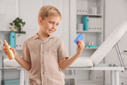 Little boy with head lice comb and remedy for pediculosis in clinic