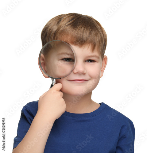 Little boy with magnifying glass on white background