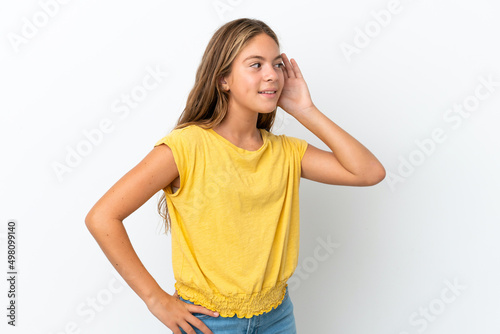 Little caucasian girl isolated on white background listening to something by putting hand on the ear