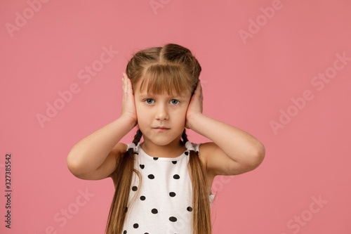 ear, hand, ignoring, face, children, sound, girl, hear, fear, cute, emotional, children, people, female, background, sad, portrait, studio, frustrated, palm, exhausted, cover, hiding, casual attire, grief, unhappy, scared, noise, stress, carefree, sleepy, afraid, 1, stressed, deaf, worry, tension, anxiety, gesture, beautiful, silence, deaf, leisure, expression, caucasian, listen, confused, attractive, feeling, pink
