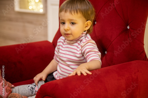 little cute toddler girl sitting in a red chair
