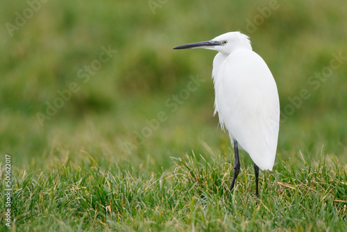 Little Egret (Egretta garzetta) standing in grass, the Netherlands