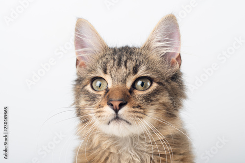 funny, lovely, kitten, young, grey, mixed breed, furry, stripped, cute, portrait, 1, white, background, head, closeup