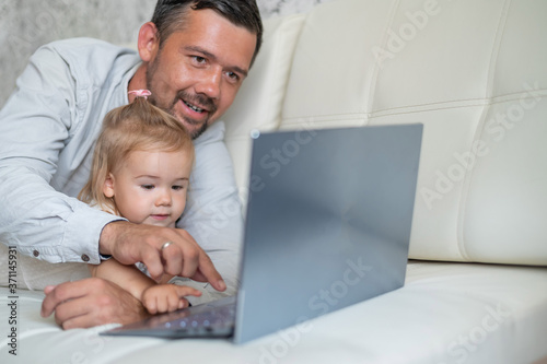 Little girl and caring father are watching cartoons on a laptop while lying on the couch at home. A man shows his little daughter photographs on a computer. Beloved daddy.