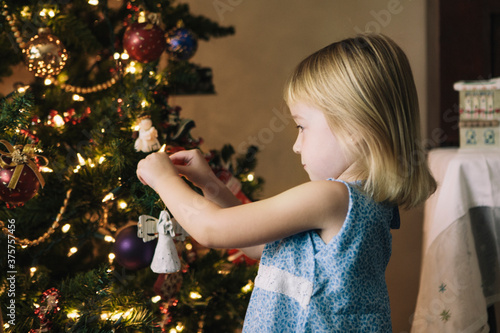 decorating, looking away, tree, standing, portrait, ornament, little girl, light, imagination, horizontal, hanging, cute, christmas tree, christmas, blond, angel, caucasian, white, girl, female, person, people, children, children, children, children, youth, youth, youngster, youngster, minor
