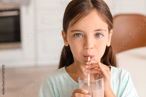 Little girl drinking tasty chocolate milk at home
