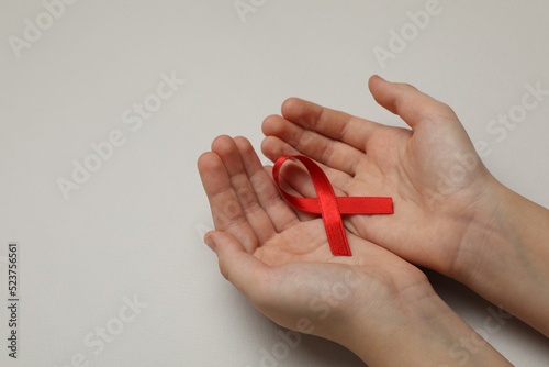 closeup, hand, awareness, disease, aids, person, children, background, colours, beige, red, ribbon, children, girl, little, space, copy, text, holding, 1, single, day, concept, protection, signs, symbol, health, care, medicine, international, december, month, week, support, human, immunity, infection, medicals, virus, charity, silk, satin, hope, prevention, medic, humanitarian, hiv, cancer