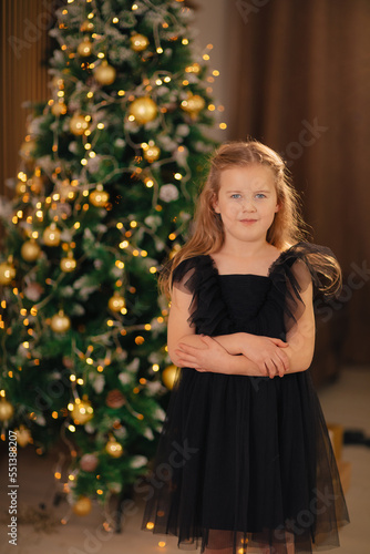 Little girl in a black dress in front of a Christmas tree. Christmas mood. fashionable girl