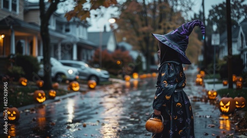 Little girl in a witch costume on a foggy street with jack-o-lanterns on Halloween night. Child in a spooky setting. Concept of Halloween, childhood, trick-or-treat, festive