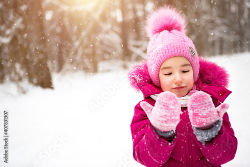 Little girl in the cold looks at the snow mittens and smiles. Winter, walk the baby in the open air, snow. Warm clothing, knitted hat, fur pompom and hood. Snowball fight, winter fun, spring is coming