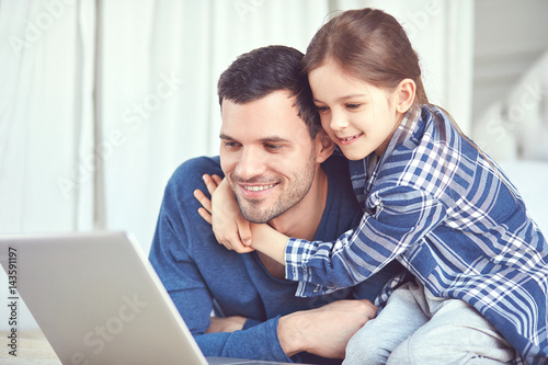 man, father, brother, girl, children, children, daughter, human relationships, family, relative, together, european, caucasian, adolescence, youth, similar, pajama, bedchamber, bed, morning, leisure, home, indoor, cosy, comfortable, grey, love, happiness, joy, interaction, mutual, communication, understanding, contraption, laptop, computer, notebook, hugging, smiling, casual attire, cyberspace, watching, motion picture, network, lifestyle, looking, device, brown, hair, rest