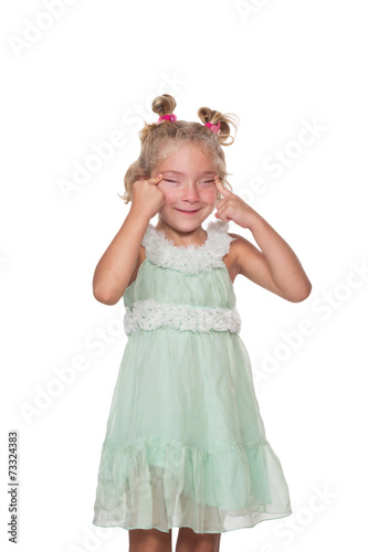 blonde hair, caucasian, cheerful, children, closeup, cool, curly hair, cute, dress, ecstatic, excitement, expression, facial expression, female, fun, funny, girl, happiness, humor, indoor, isolated on white, lady, lifestyle, little girl, people, photo, playful, playing, portrait, smiling, standing, studio shot, toddler, white, white background, youth