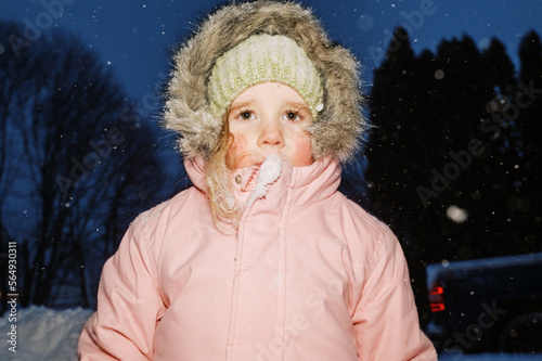authentic, brother, childhood, clothing, coat, dark, face, family, flash, jacket, nature, night, outdoors, pink, real, sister, snow, winter