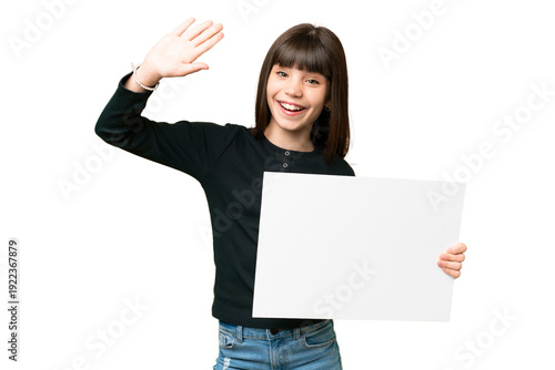 Little girl over isolated chroma key background holding an empty placard and saluting