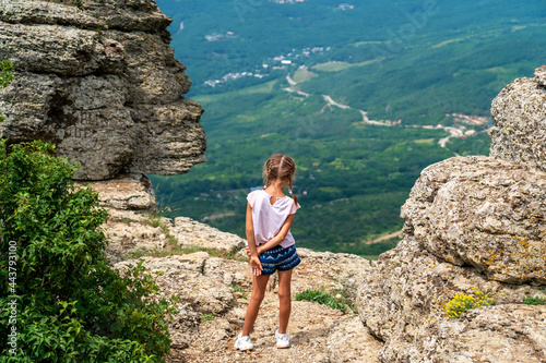 Little girl standing on top of mountain and looking to valley and peaks below. Healthy outdoors lifestyle concept