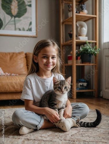 Little girl with her adopted kitten in her room during the day.