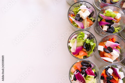 Little glasses with fresh salads, eggs, salmon and cucumbers standing on white table