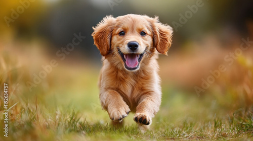 little golden retriever puppy is joyfully running forward in grassy field, showcasing its playful spirit and fluffy fur. warm colors of background enhance cheerful atmosphere
