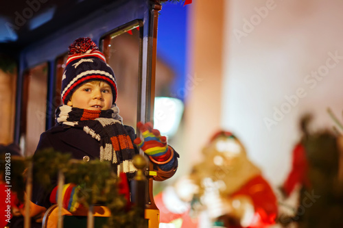 Little kid boy on carousel at Christmas market