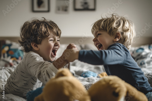 Little kids are fighting in room at home. Babies crying and screaming. Relations of sibling in family. Babies adaptation in groups