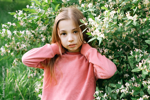 little kind girl in a pink velor suit in the spring in the park near a flowering bush with white flowers