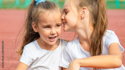 sport, basketball, children, ball, outdoors, play, portrait, to sit, fun, sister, court, friendship, training, player, leisure, people, childhood, game, children, smile, hobby, children, happy, stadium, recreation, teenage, outside, summer, together, family, 2, girl, exercise, posing, sibling, relaxation, anticipation, lifestyle, rest, exercising, caucasian, waiting, sporty, relax, friendly, friends, cheerful, little, field