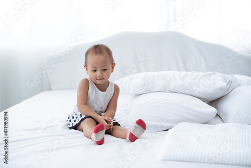 little lovely Asian toddler sitting on white bed, nursery place, baby playing alone