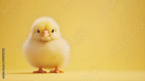 Little newborn chicken on yellow background. Yellow bird on spring sunny backdorp. Happy Easter concept. Banner, card with cute funny chick pet. Organic farm, love animals theme with copy space.