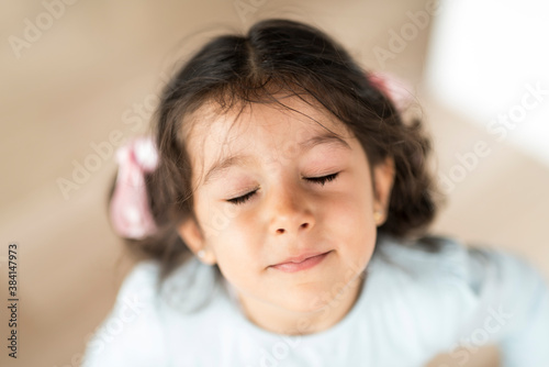 Little pretty girl portrait looking at camera with closed eyes