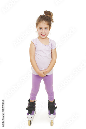 Little pretty girl riding a roller. Isolated on white background