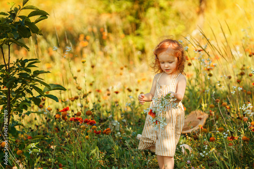 girl, children, toddler, redhead, bouquet, flower, wildflower, meadow, summer, outdoors, dress, striped, movement, walking, running, giving, nature, sunny, day, joy, innocence, freedom, light, warm, softness, childhood, tenderness, love, gesture, connection, path, journey, bloom, countryside, happiness, moment, emotion, field, life, beauty, carefree, dream, gold, sincere, hope, playful, storytelling, purity