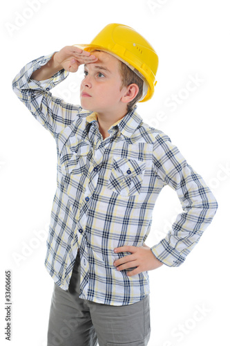Little smiling builder in helmet