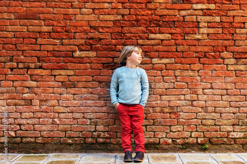 Little stylish blond boy posing against red brick wall, wearing terracotta trousers, blue pullover and brown vintage shoes