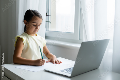 Litttle girl looking at laptop screen with expression of surprised and excitement. Smart, smilling little girl taking notes . Communication in business concept.