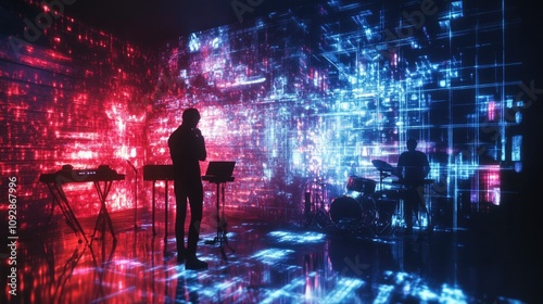 electronic, music, performance, live, stage, cosmic, digital, star, light, silhouette, concert, sound, futuristic, artistic, technology, dj, multimedia, galaxy, audience, entertainment, festival, interactive, vibrant, neon, creative, rythm, modern, visual