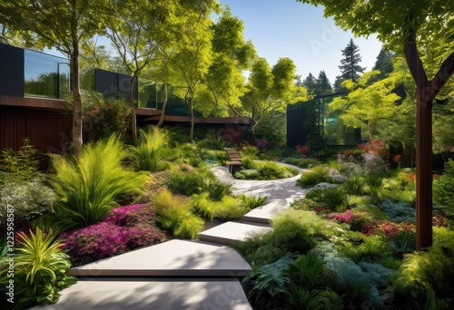 lively displays vibrant greenery contemporary outdoor spaces showcasing modern landscaping eco friendly design elements, aesthetic, architecture, arrangement