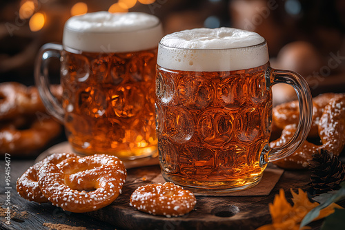 Lively Oktoberfest scene showcasing traditional beer mugs and pretzels, embodying the festive spirit of this iconic German celebration.