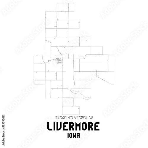 Livermore Iowa. US street map with black and white lines.