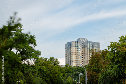 living multi apartment building ordinary object in city with green park zone horizon fluffy blue sky