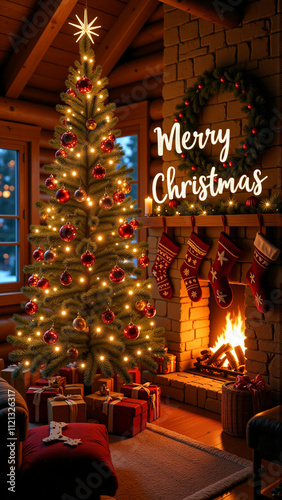 christmas, tree, fireplace, christmas tree, decoration, holiday, room, light, christmas, home, winter, interior, fire, celebration, night, house, present, decoration, santa, light, window, ornament, decor, gift, festive