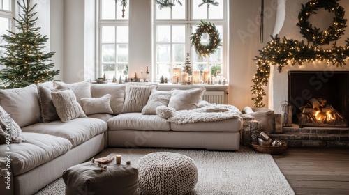 winter, holiday, living, cosy, home, fireplace, tree, sofa, comfort, cushion, interior, festive, lighting, window, carpet, textile, ornament, seasonal, hearth, atmosphere, garland, chaplet, candle, pillow, relaxation, decoration, domestic, residence, wooden, furniture, illuminated, log, glowing, burning, arrange, threaded, gift, present, ottoman, neutral, neutrality, indoor, stylish, element, blanket, arrangement, celebration