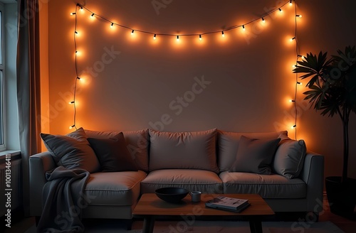 Living room decorated with Christmas lights on the wall