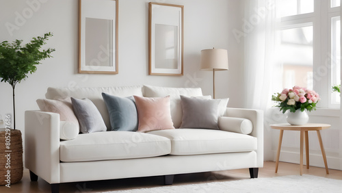 Living room interior with white sofa and pillows. 3d rendering.