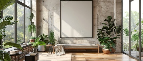 Living room with a blank frame on the wall, modern furniture, plants, and wooden floor, with natural light coming through large windows,