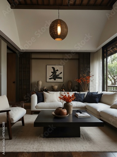 Living room with a blend of minimalism and Asian antique culture, showcasing clean design.