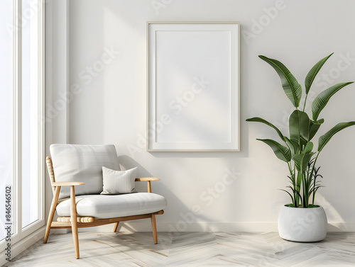 Living room with chair and blank frame mockup on the wall