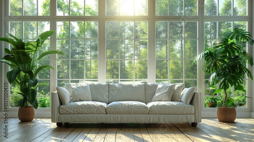 Living room with sofa and large glass windows, Modern house interior furniture.